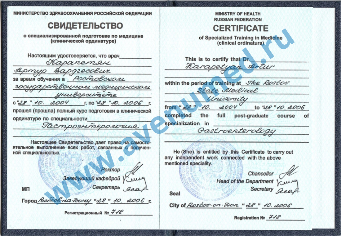 • 2006 г. - ординатура по специальности "Гастроэнтерология", Ростовский государственный медицинский университет.