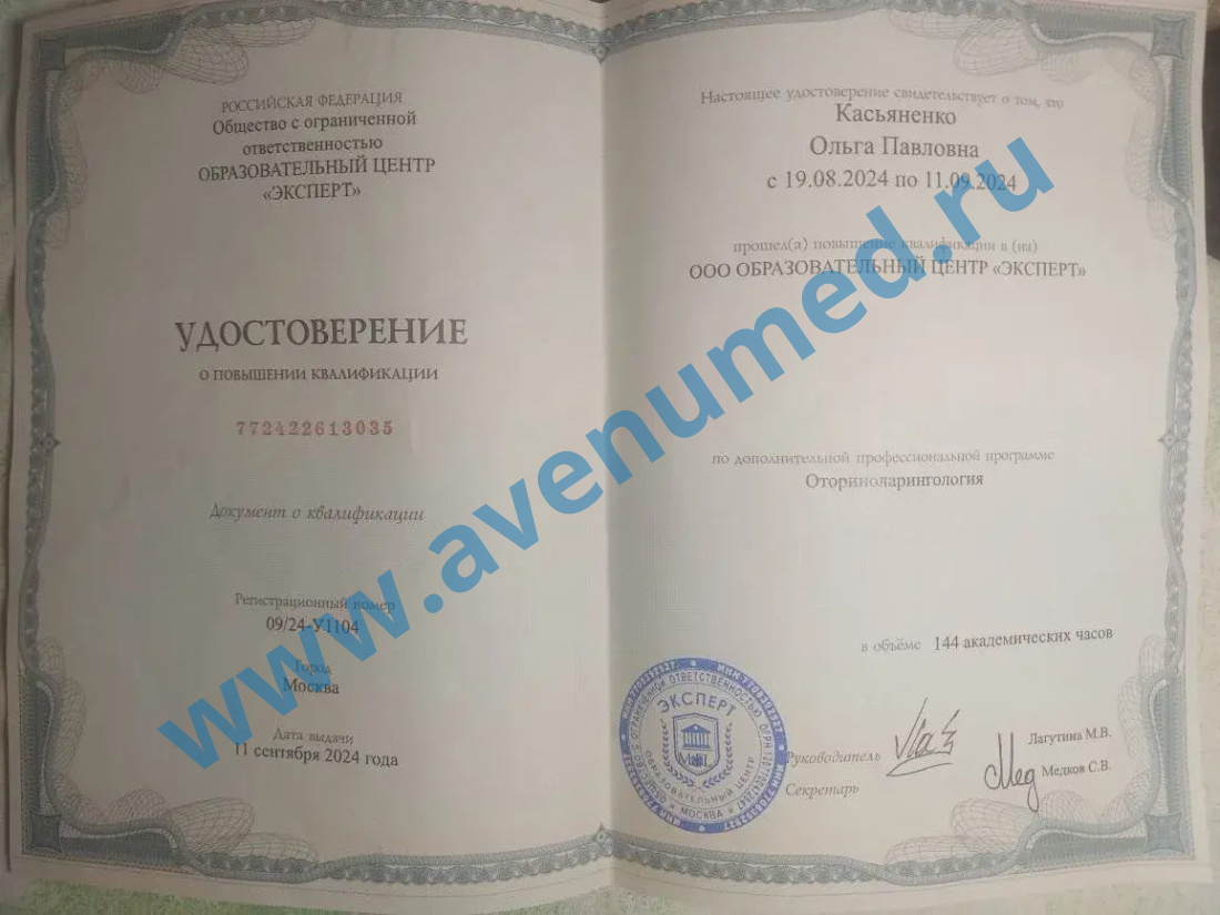 хочу выразить благодарность ЛОР врачу вашей клиники Касьяненко Ольге Павловне. Знаю доктора много лет, была очень рада встрече с ней в вашей клинике. Ольга Павловна высоко квалифицированный специалист, чуткая, внимательная всегда внимательно выслушает, осмотрит, поставит верный диагноз, назначит эффективное лечение, объяснит что и когда пртнимать. Очень довольна обслуживанием в вашей клинике, желаю вам процветания и побольше таких врачей как Ольга Павловна. Обязательно буду рекомендовать знакомы вашу клинику.