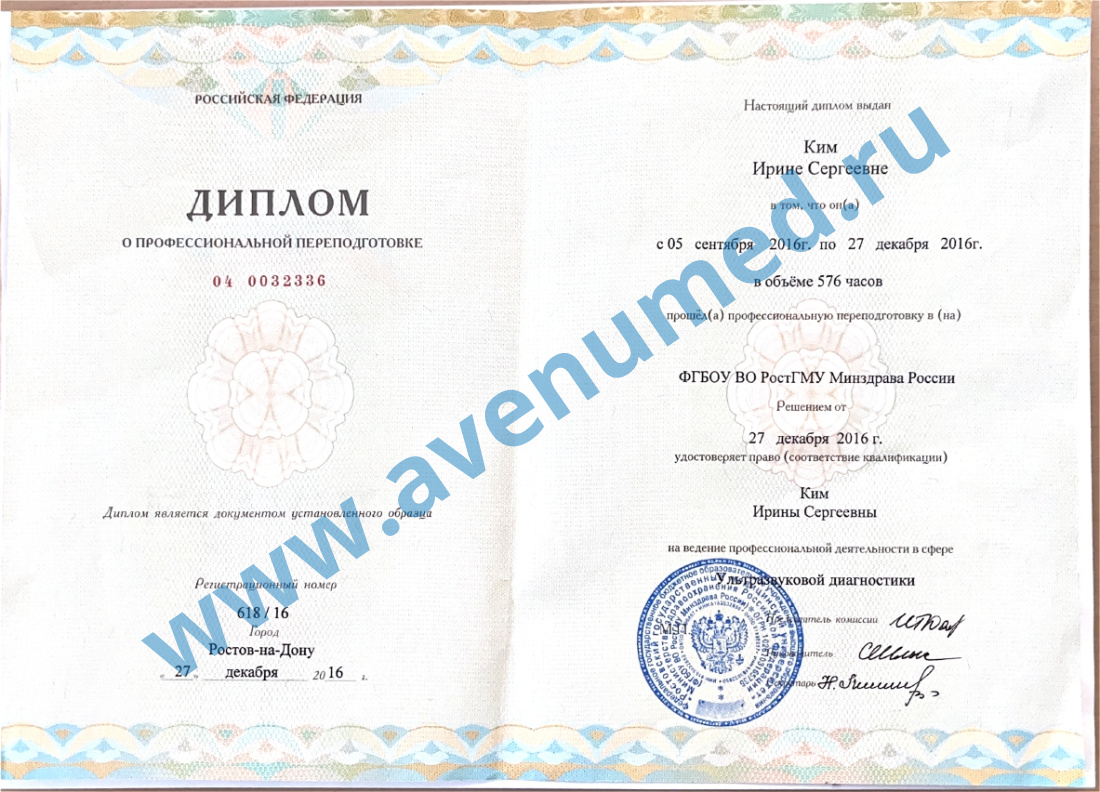 • 2016 г. - профессиональная переподготовка по программе "Ультразвуковая диагностика".