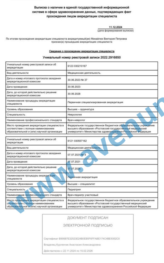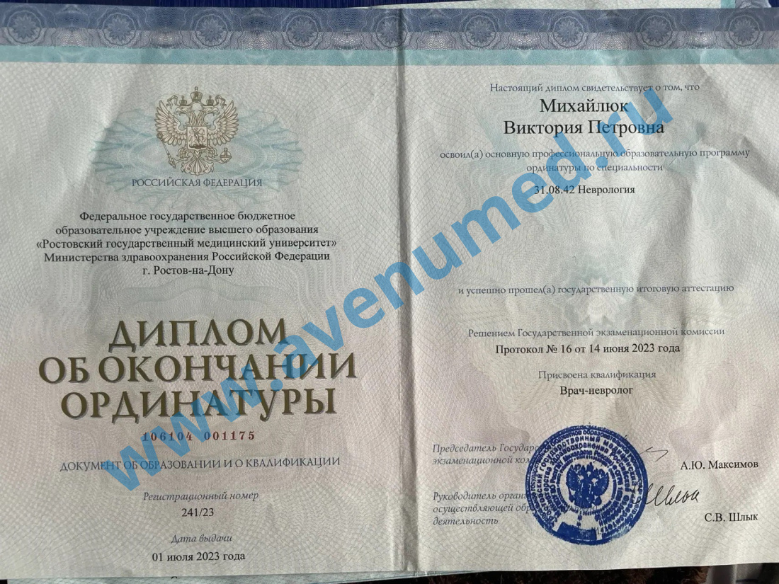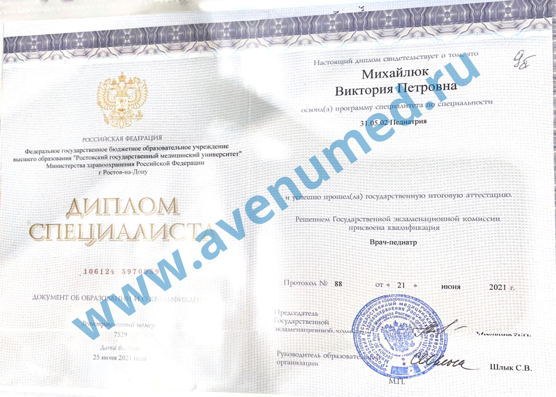 • 2021 г. - Ростовский государственный медицинский университет по специальности "Педиатрия".