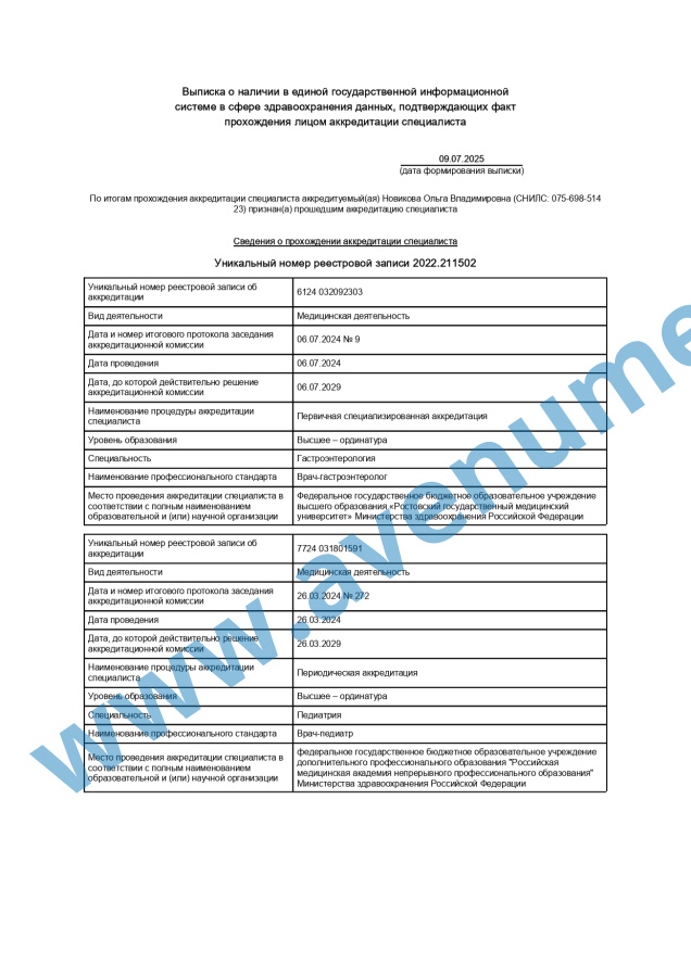• 2024 г. - профессиональная переподготовка по программе "Гастроэнтерология", ФГБОУ ВО РостГМУ Минздрава России.