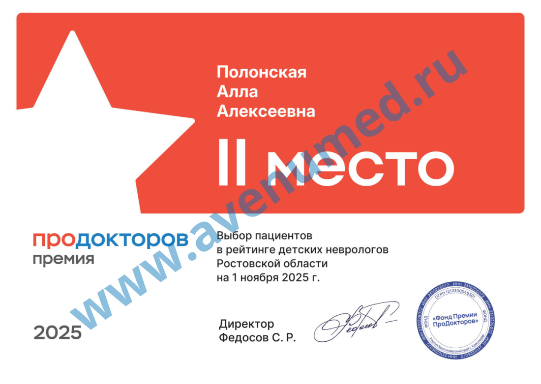- 2025 г. - 2 место в рейтинге детских неврологов Ростовской области, премия ПроДокторов.
