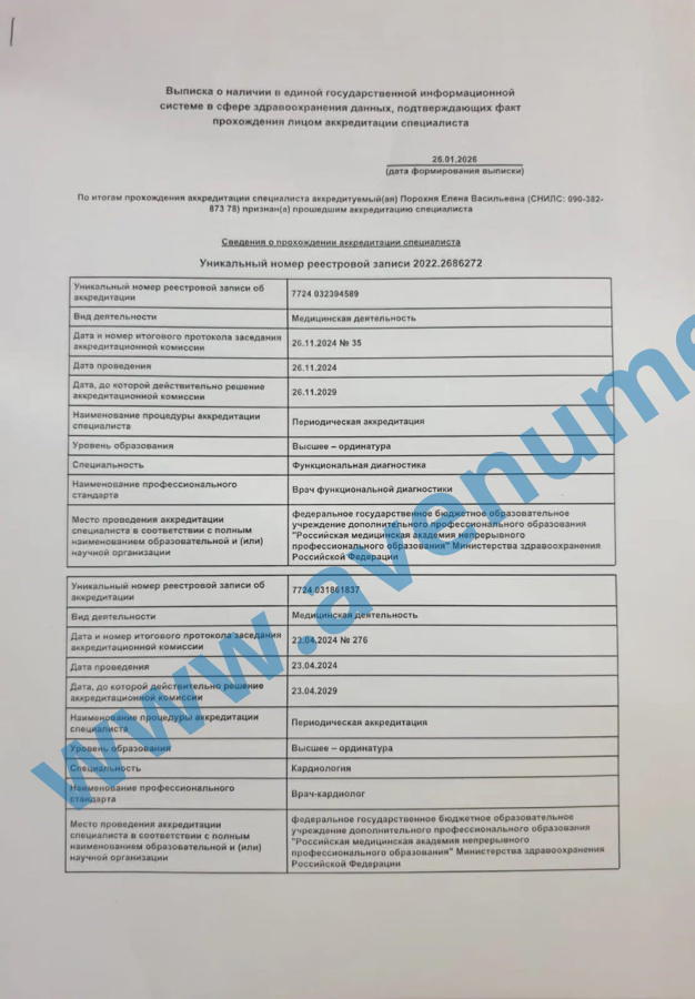 - 2008г. – присвоение высшей квалификационной категории по специальности Кардиология, подтверждение - в 2013г.