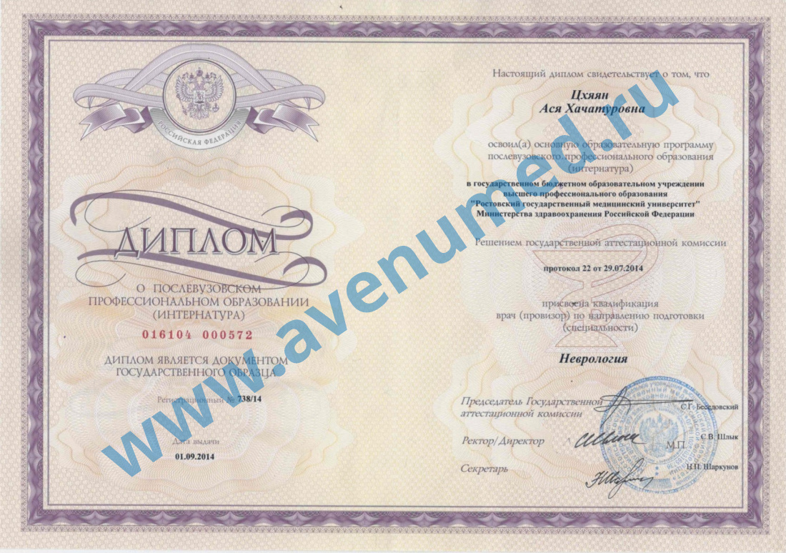 • 2014 г. - интернатура по нервным болезням на кафедре неврологии РостГМУ.
