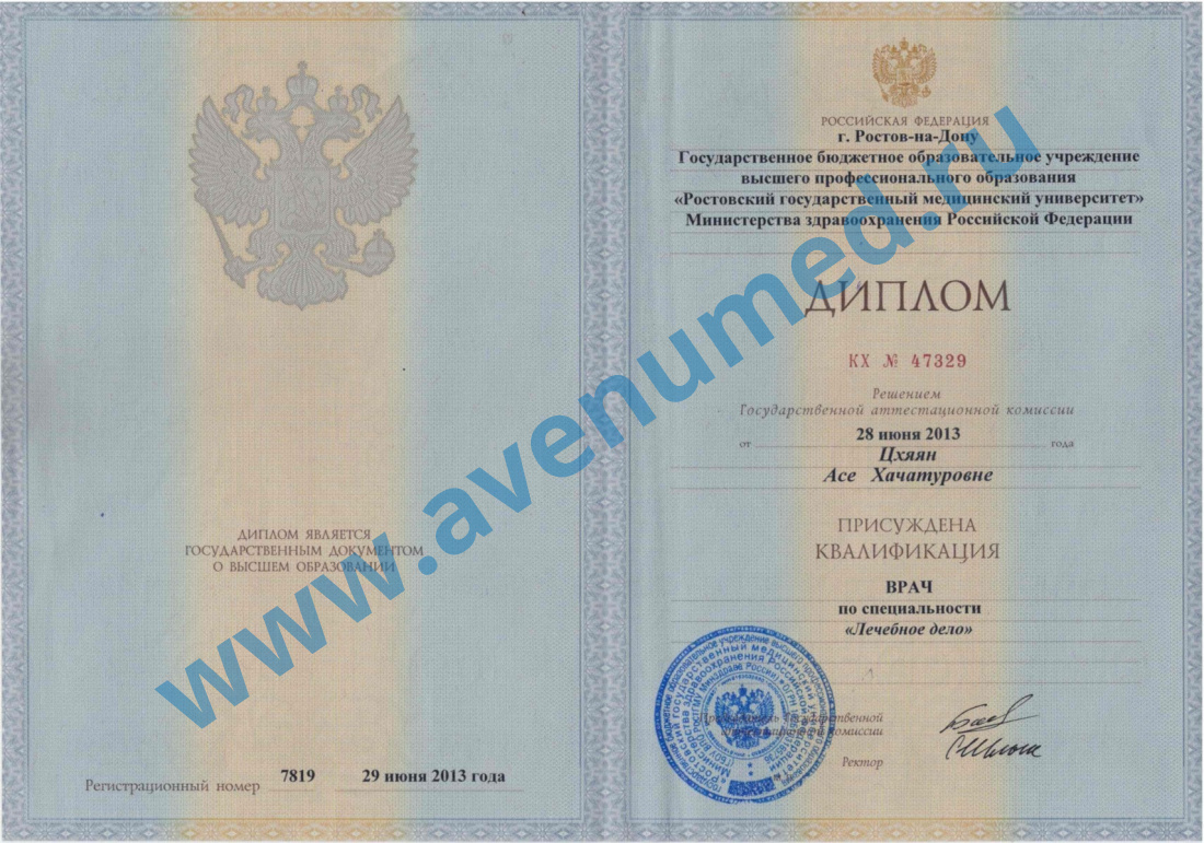 • 2013 г. - Ростовский государственный медицинский университет по специальности "Лечебное дело".