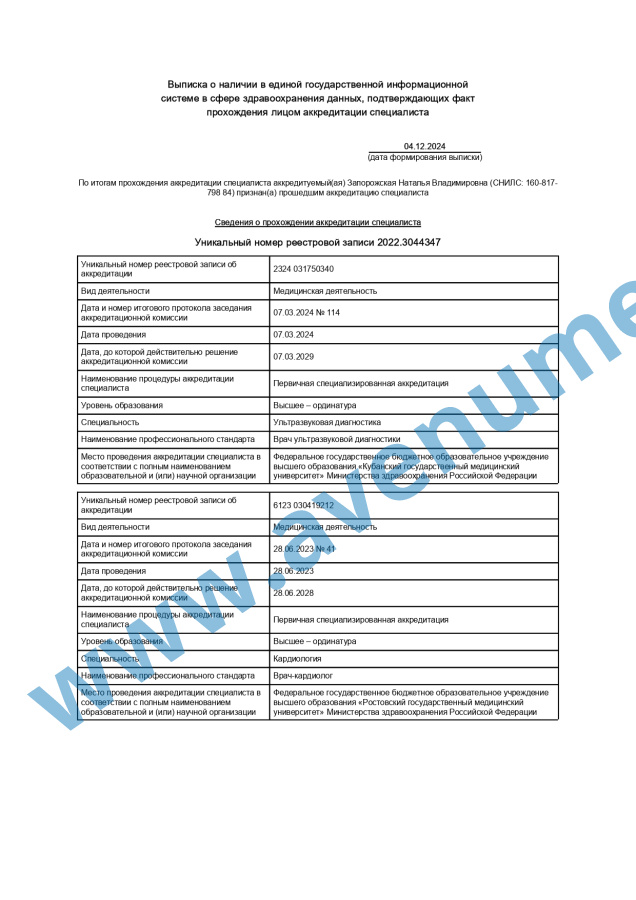 - 2023 г. - Академия повышения квалификации и профессиональной переподготовки, переподготовка по программе "Ультразвуковая диагностика".
